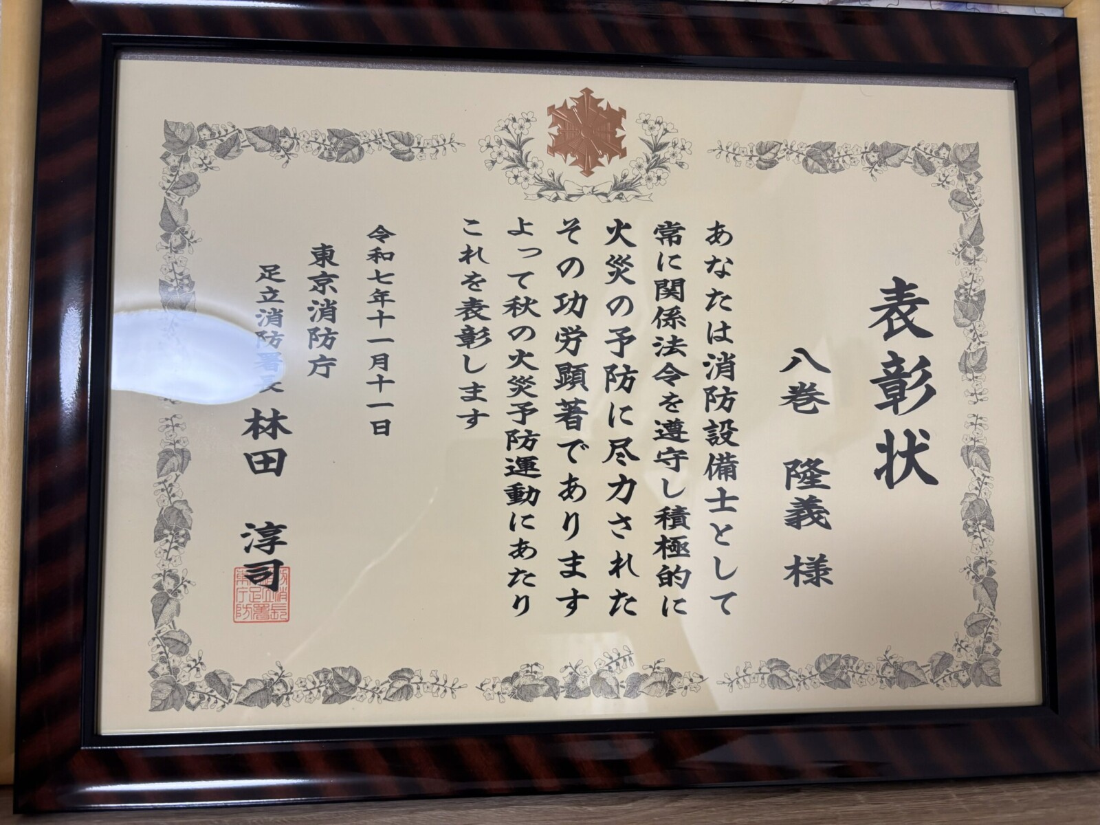 足立消防署から表彰状をいただきました。